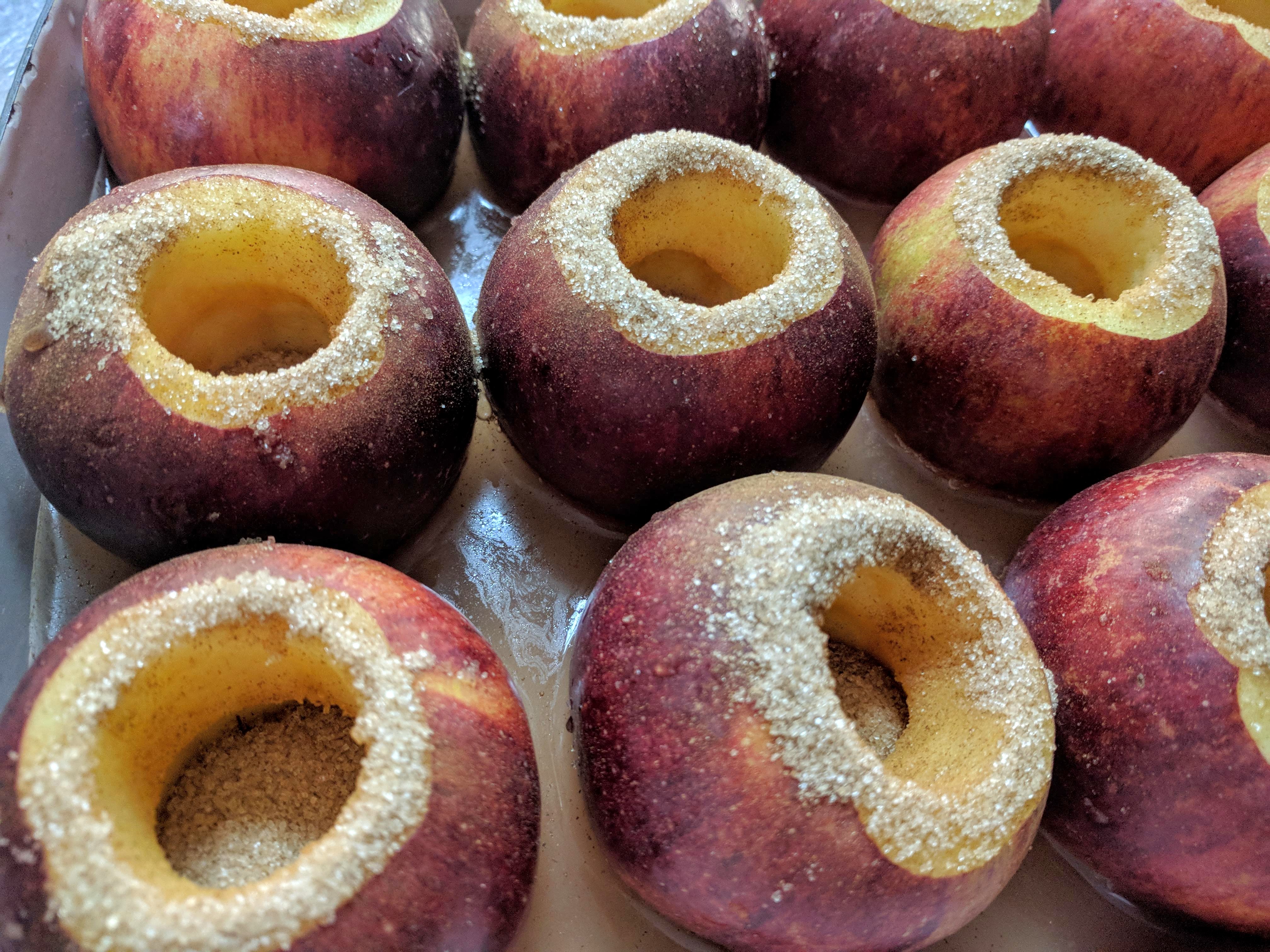 2. Place apples in glass or ceramic baking dish just large enough to hold them without touching. Fill each apple cavity with 1 Tablespoon of cinnamon sugar. Pour apple cider into pan around apples and add additional water to come ⅓ of the way up the sides of the apples. Add vanilla bean to the pan, if using.