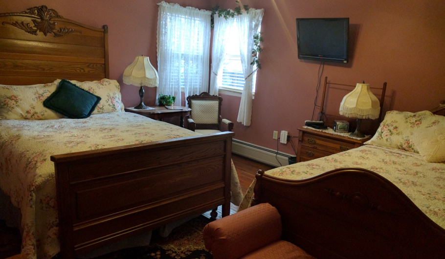 Wine and Roses, with its antique oak queen and full sized beds, walk-in closet and large bath with clawfoot tub and shower is perfect for families with children or two adults traveling together who do not wish to share a bed. Whether a college visit, vacation or traveling to the area with children, Wine and Roses makes the perfect accommodation. Located on the first floor, this room also meets the needs of those who do not wish to navigate stairs.